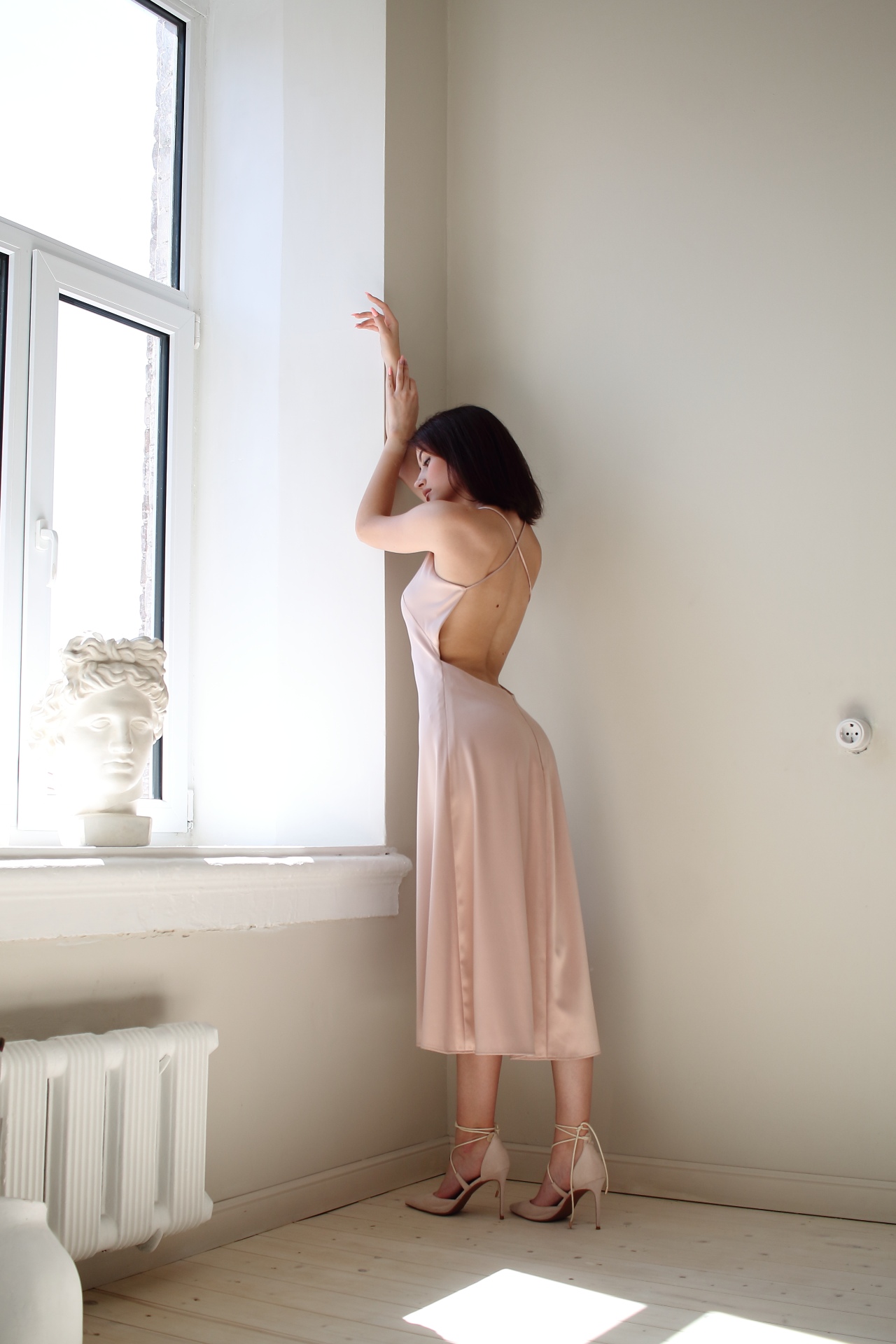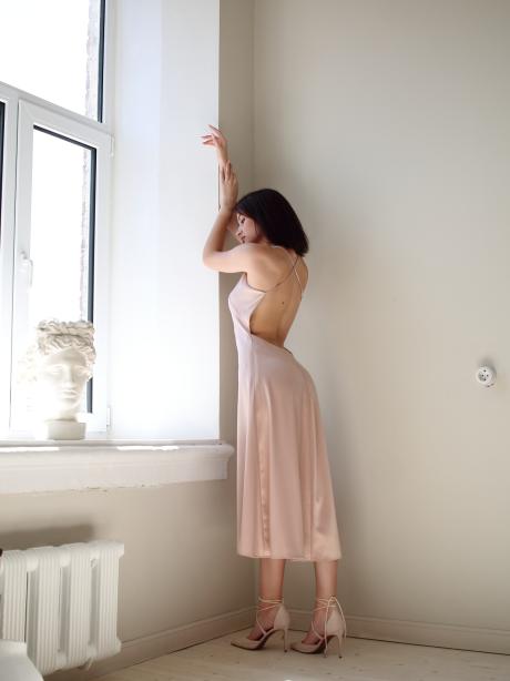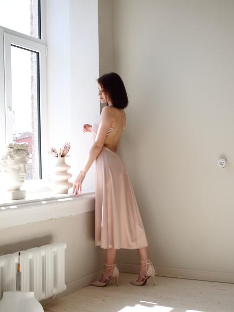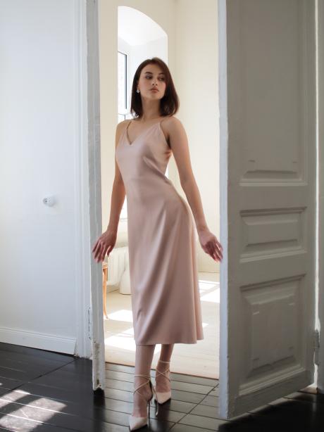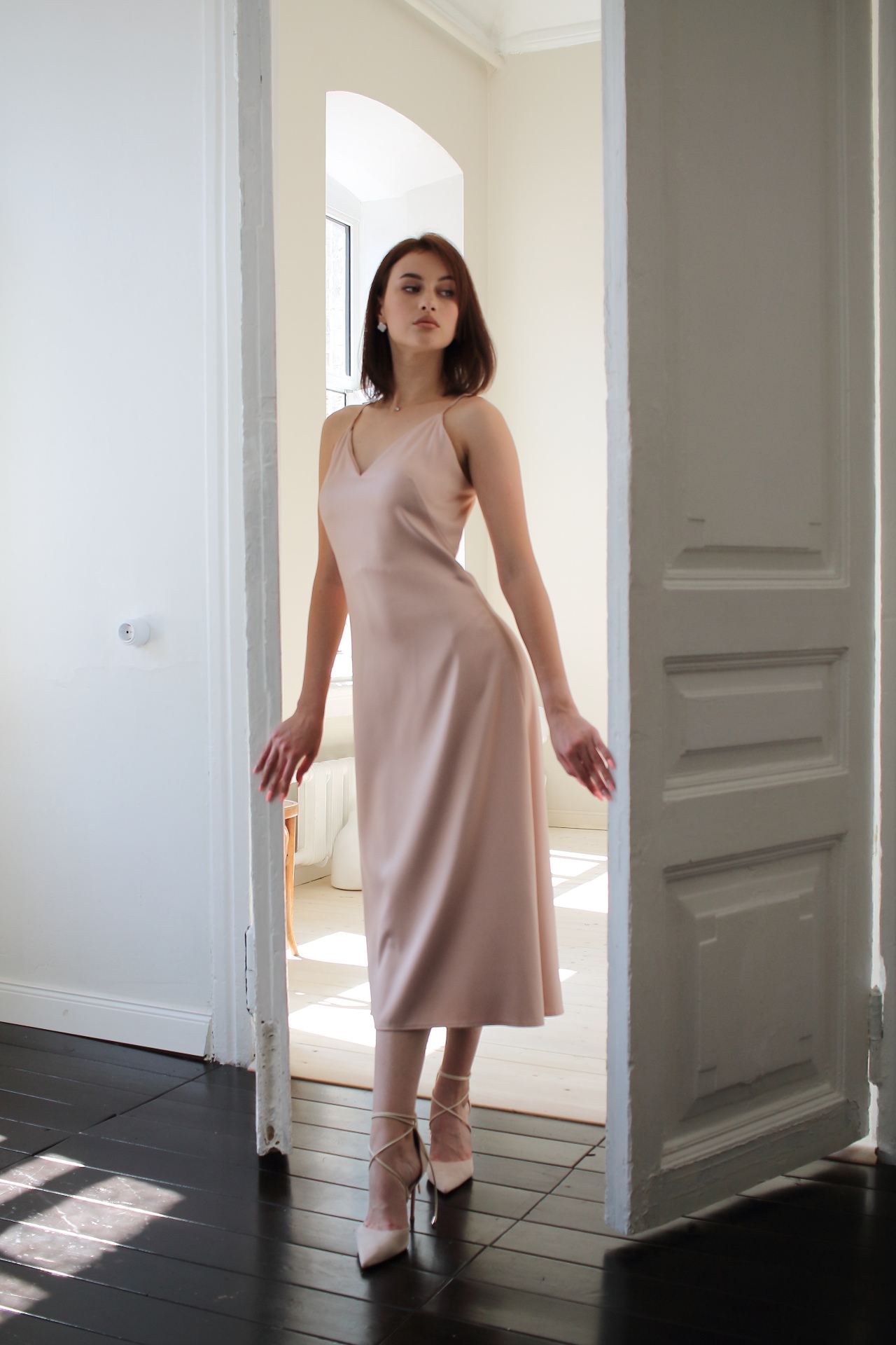 Платье в бельевом стиле, на бретельках, с открытой спиной, длина миди. Цвет пудрово-бежевый