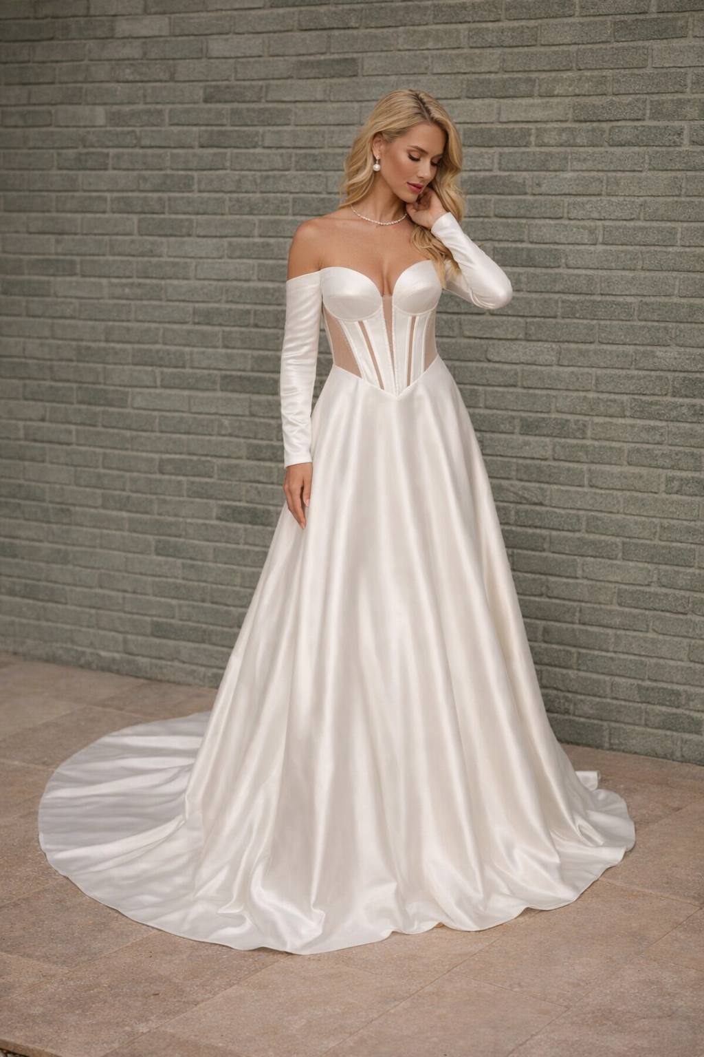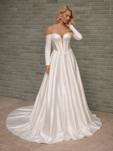 Свадебное платье с шлейфом, атласное. Корсет с вставками из прозрачной сетки