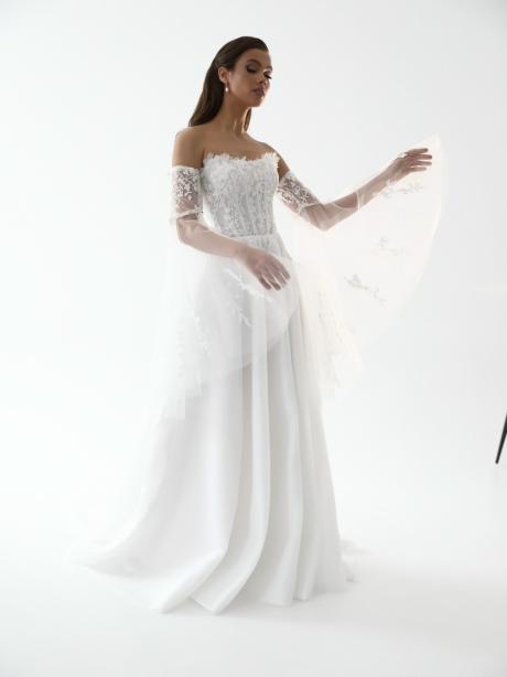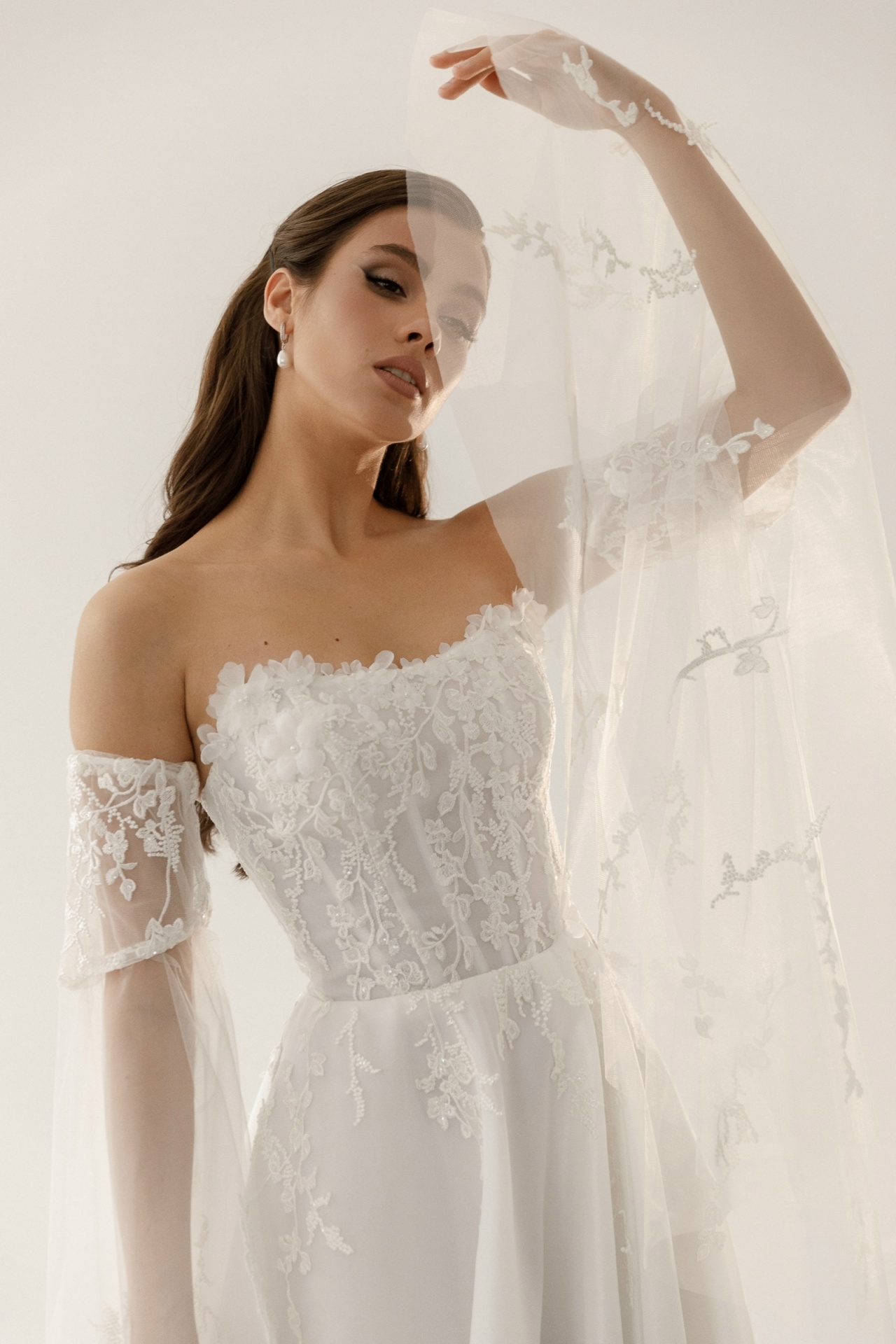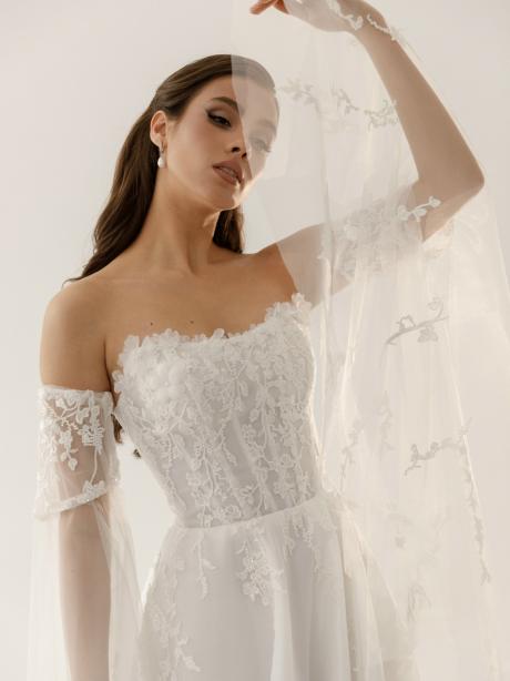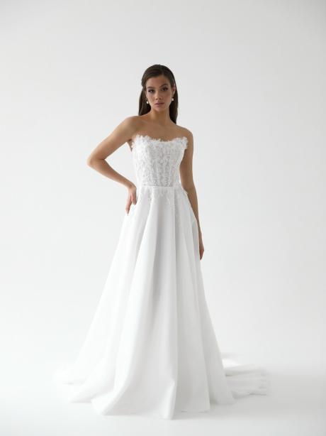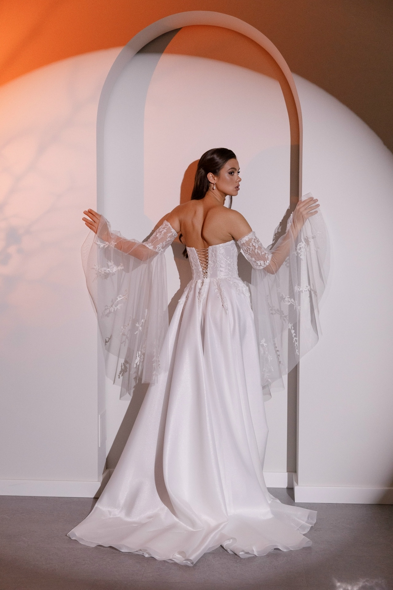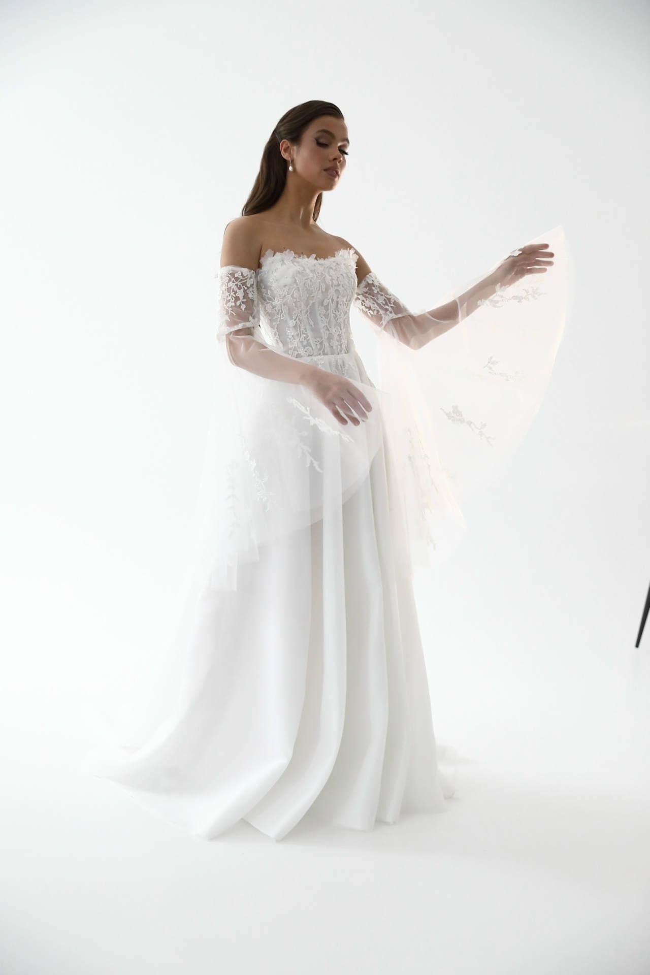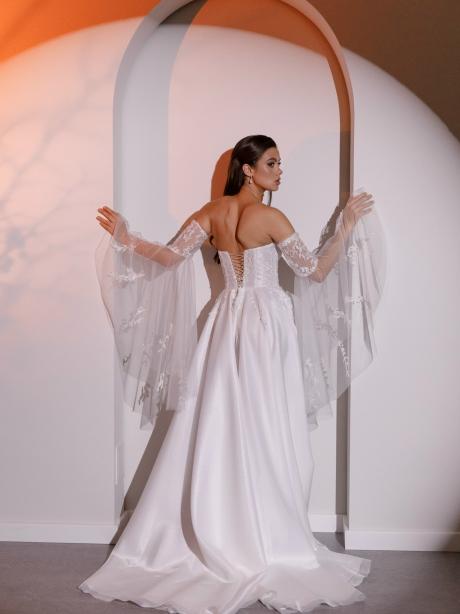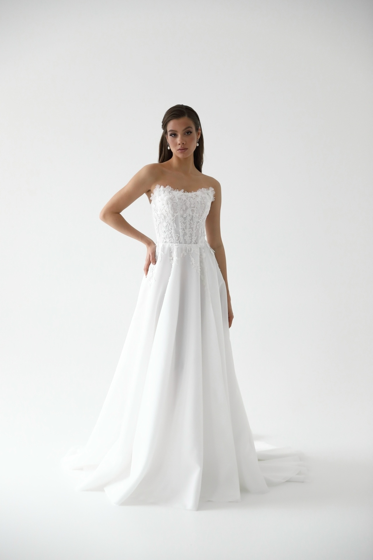Свадебное платье из кружева и плотного атласа с блеском. Корсет расшит объёмными цветами. Пышная юбка с разрезом