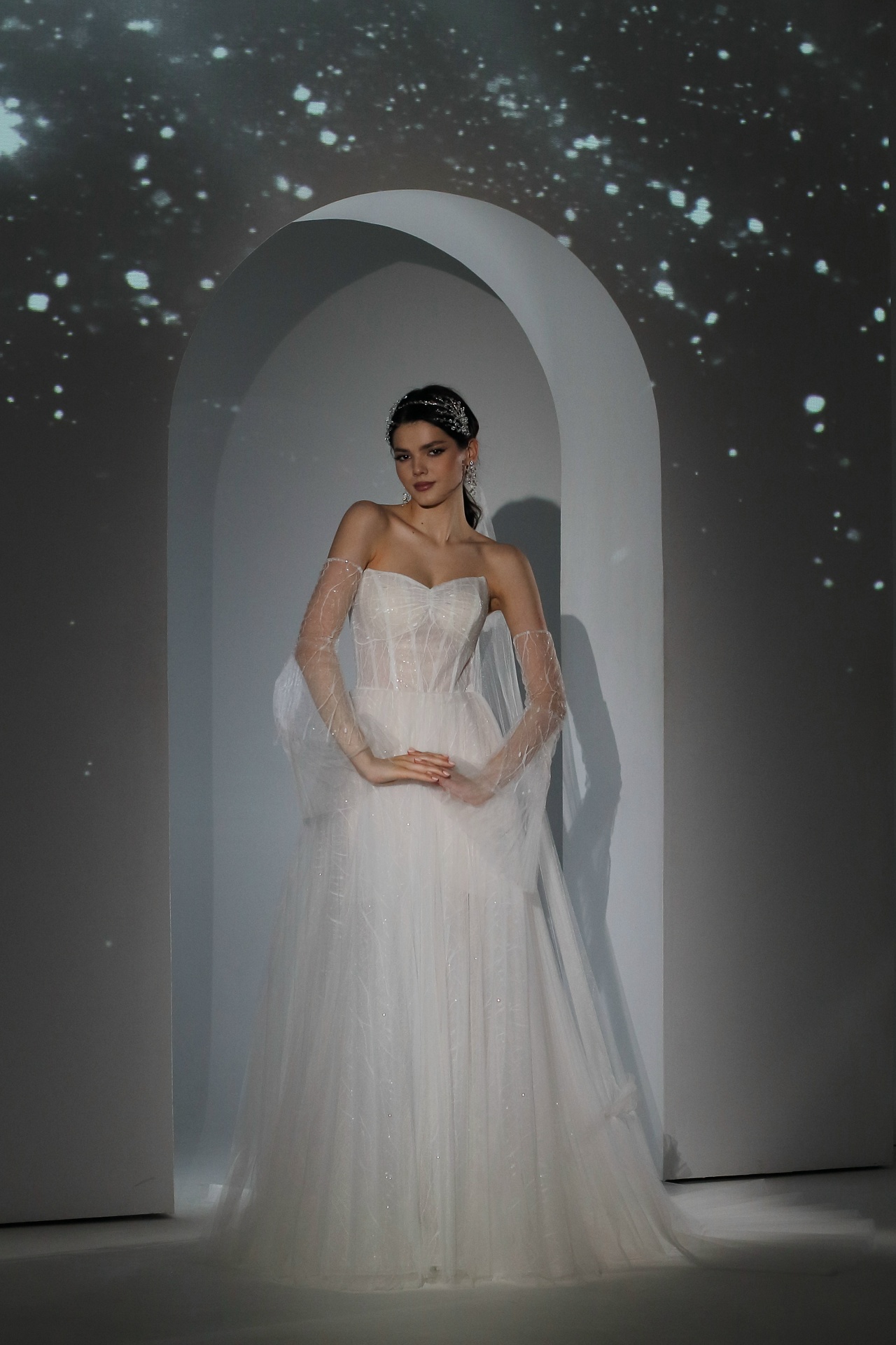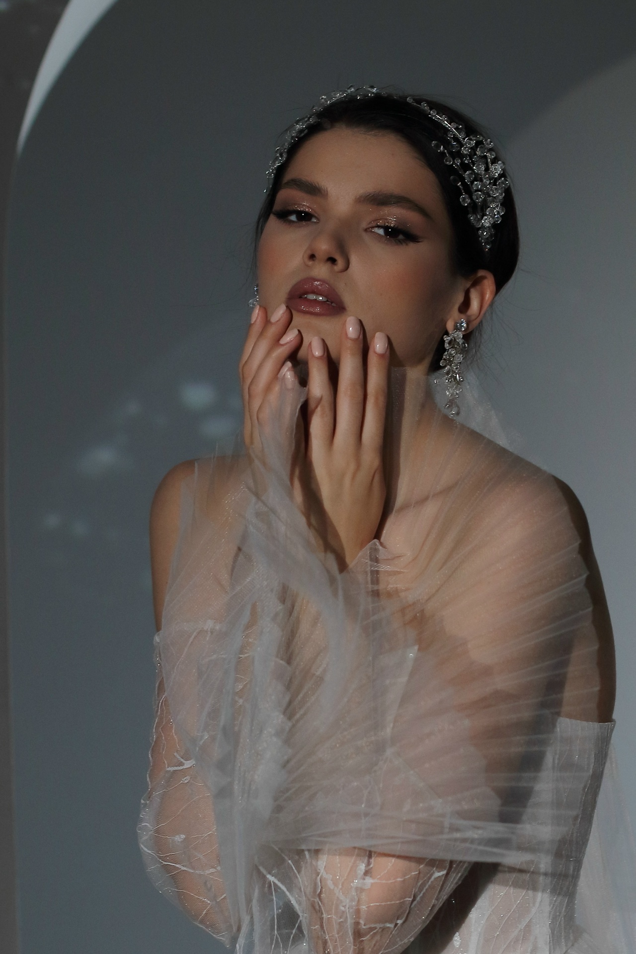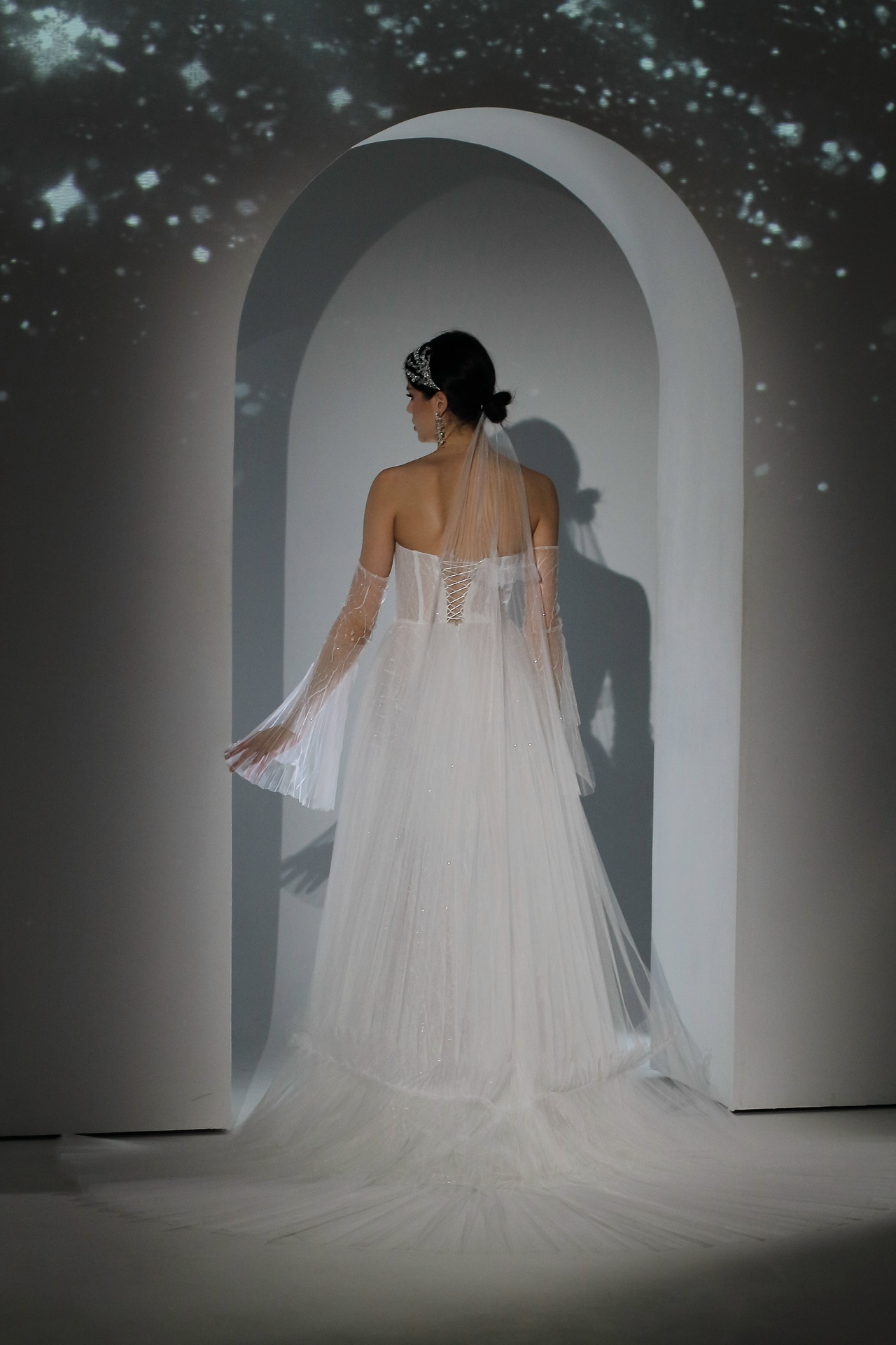 кружево с пайетками, плиссированный фатин