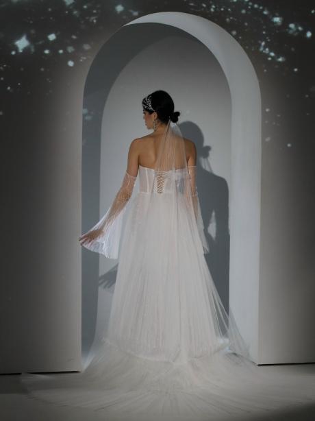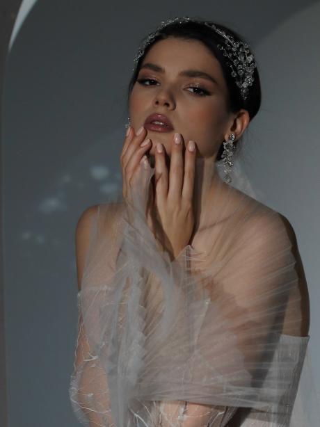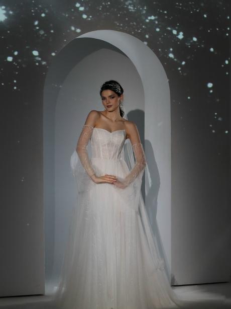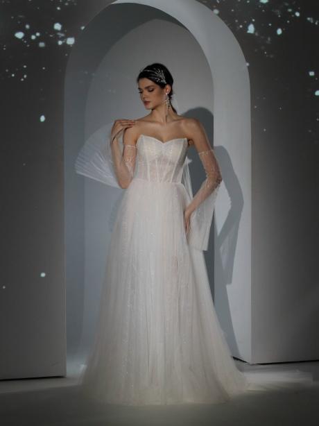 Корсетное платье выполнено из кружева с пайетками, плессированного фатина. Нежный и утонченный образ подчеркнёт всю торжественность Вашего дня. Подойдёт как для большой свадьбы, так и для маленького мероприятия.