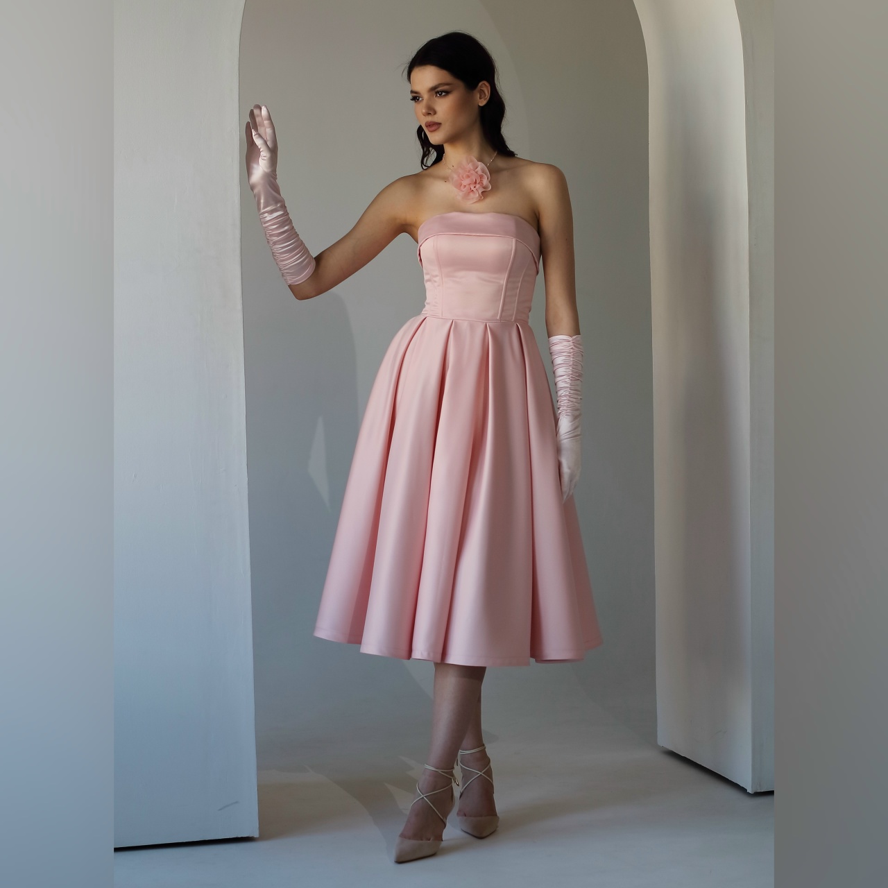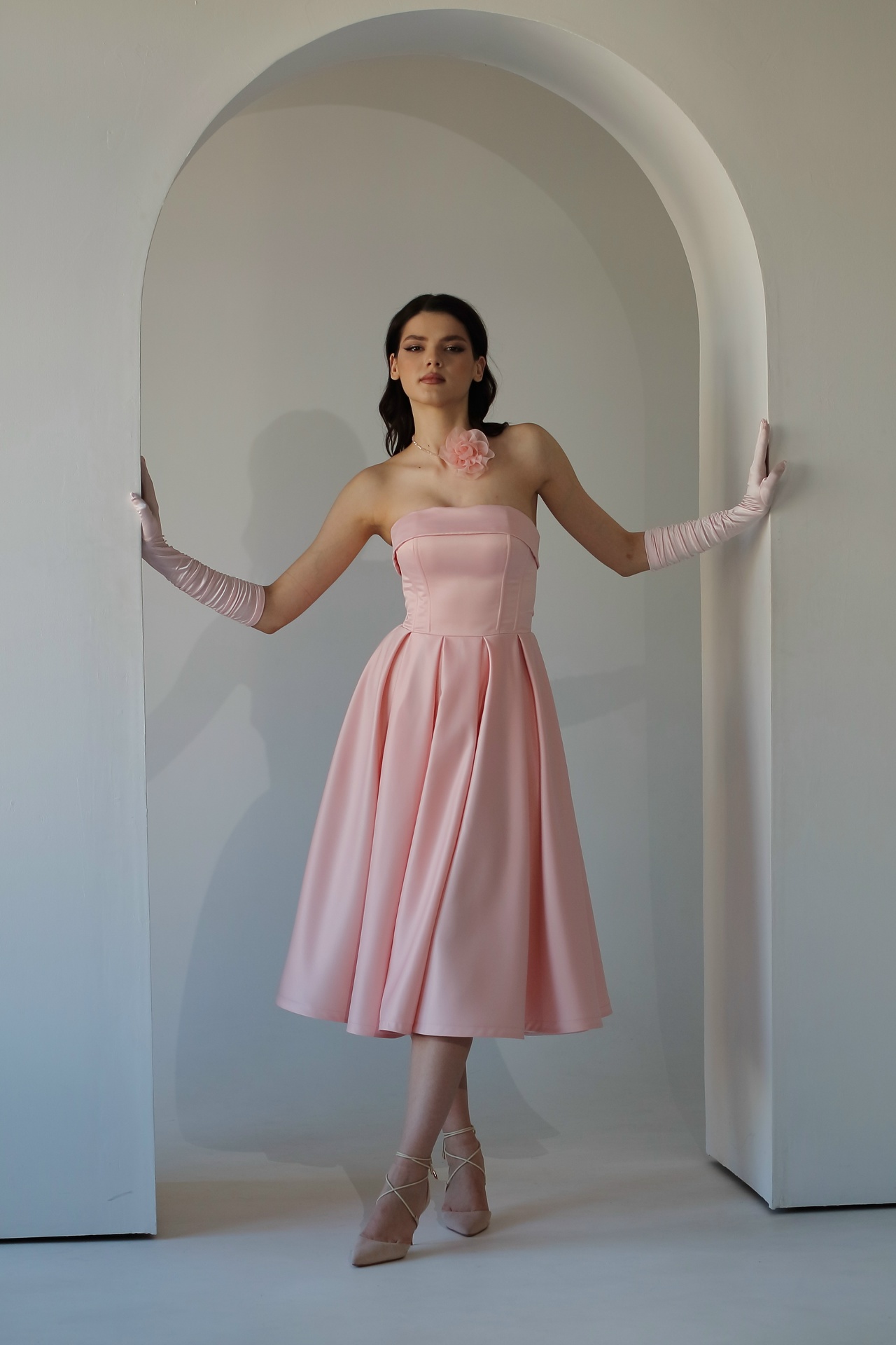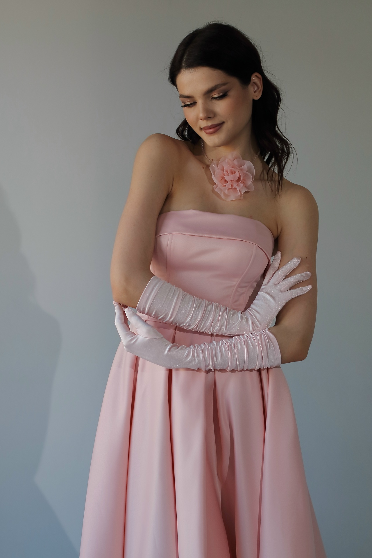 Вечернее корсетное платье Sher нежно-розового цвета, в длине миди. Платье на выпускной.
