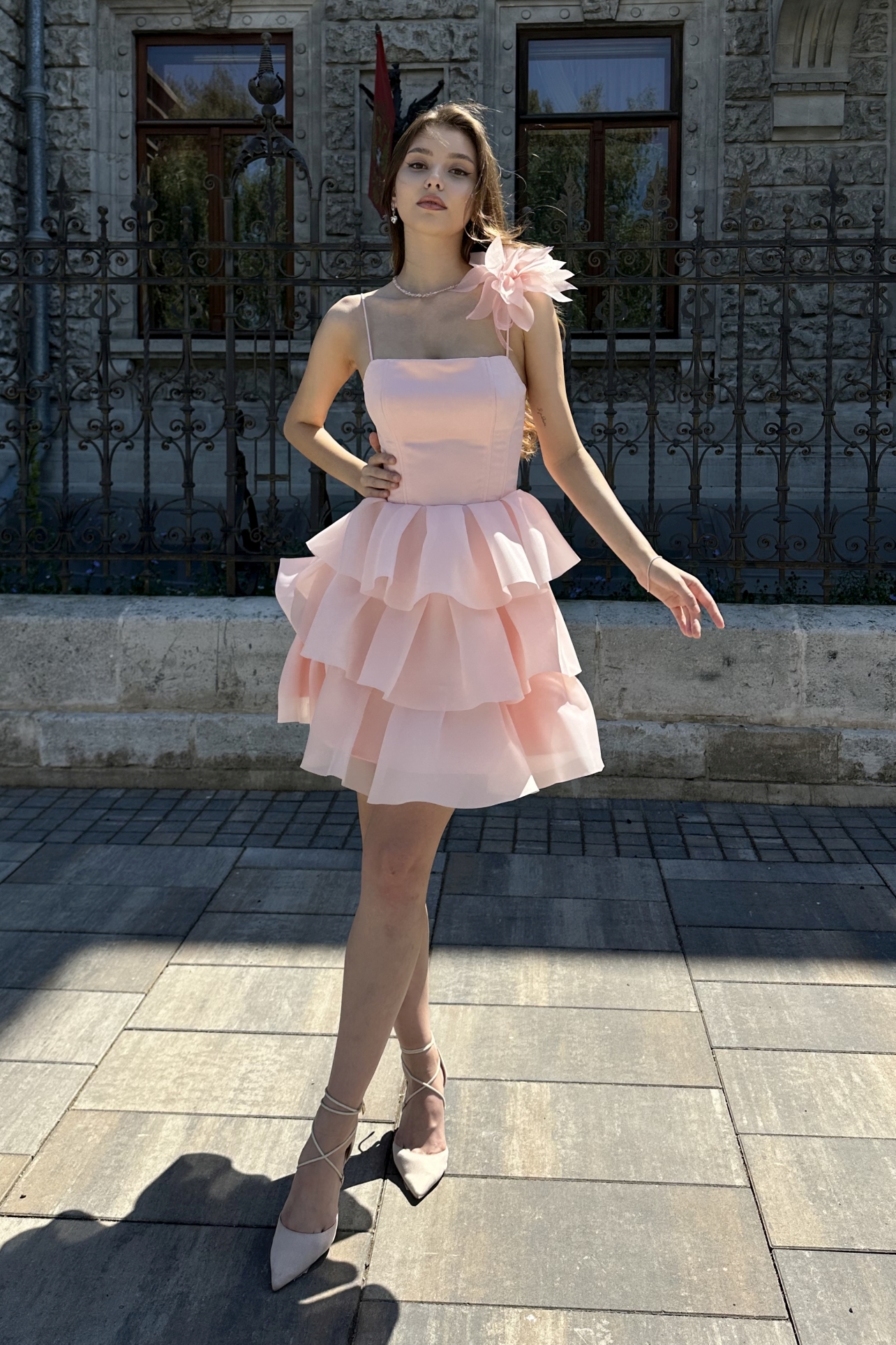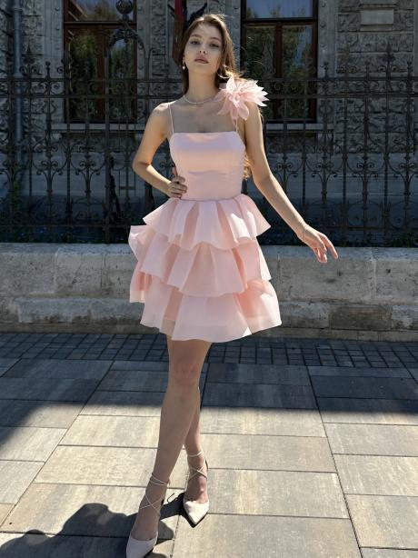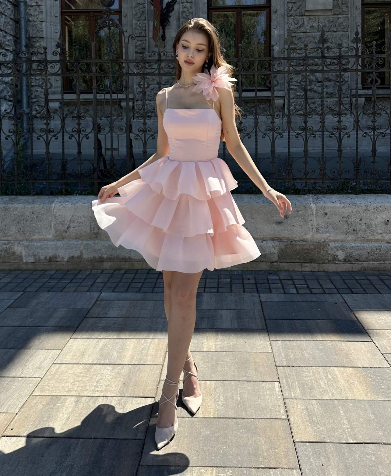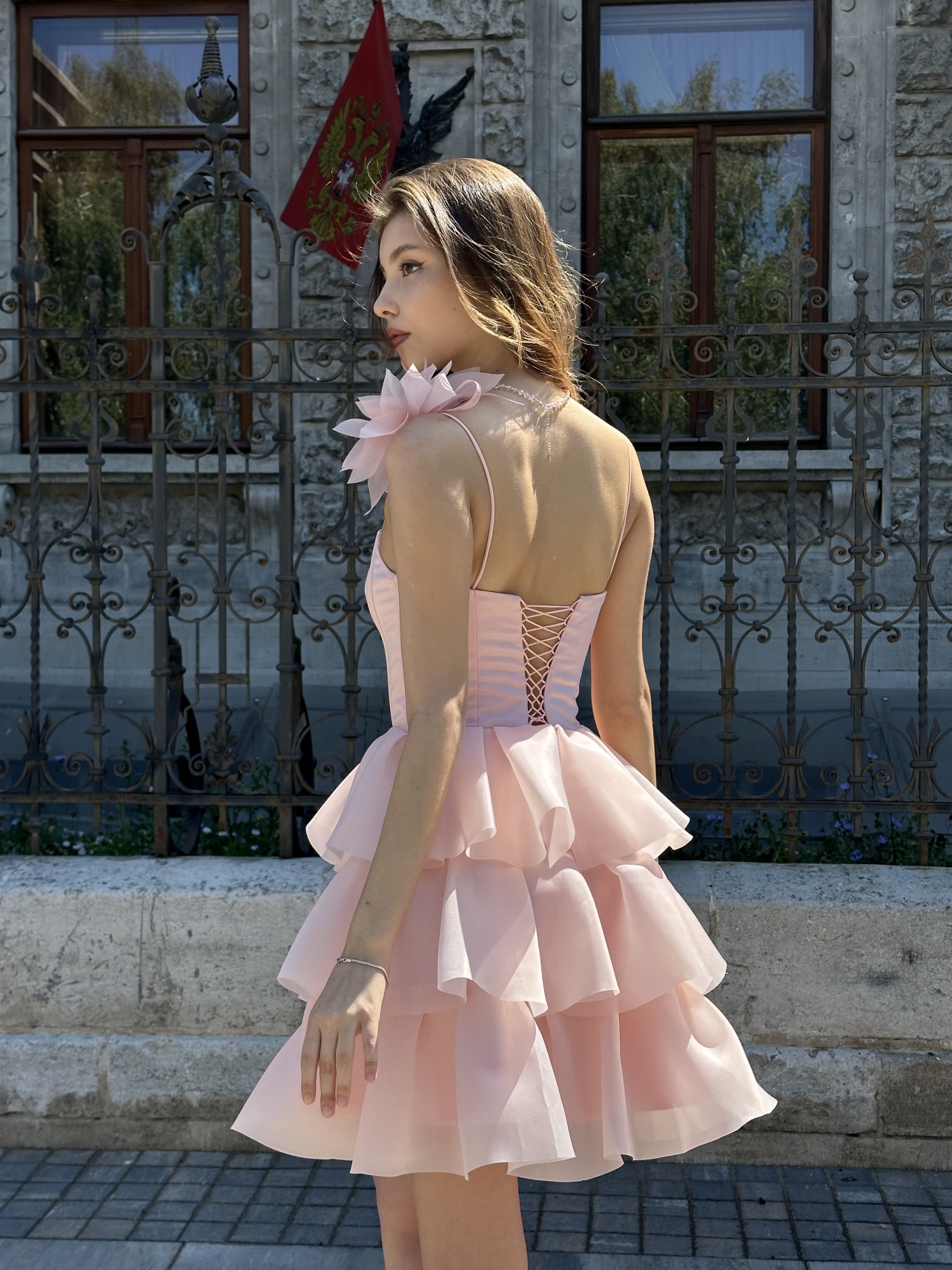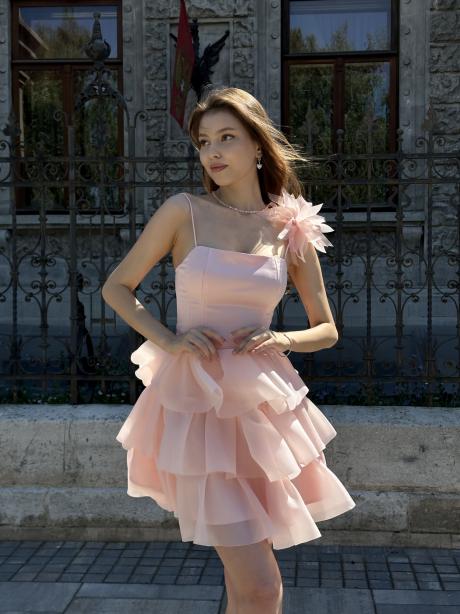 Короткое вечернее платье. Атласный корсет и юбка из органзы с воланами. Корсет придает изящность фигуры девушки, а легкая юбка с многослойными воланами игривый образ.
