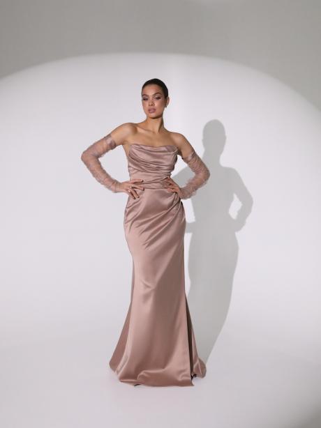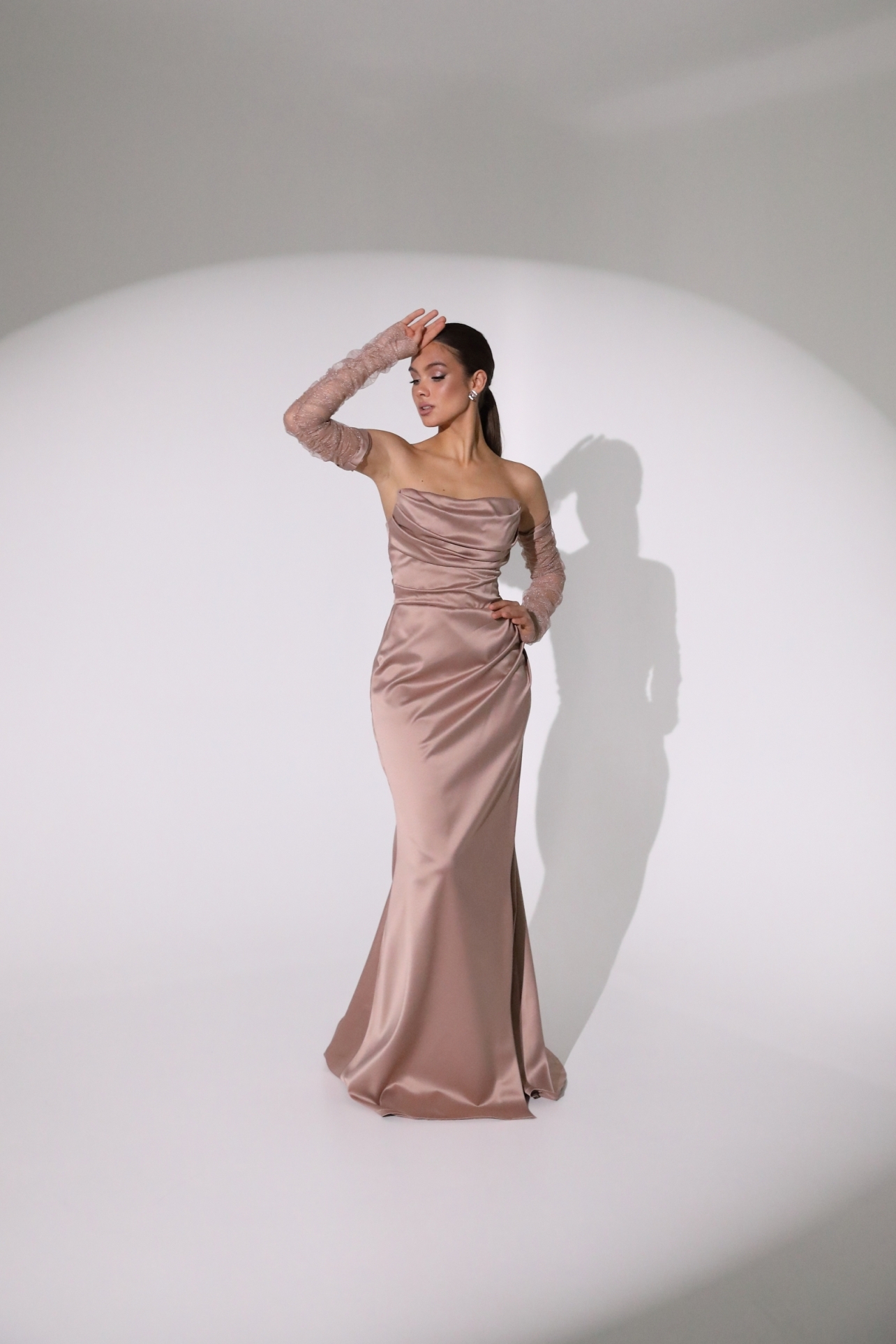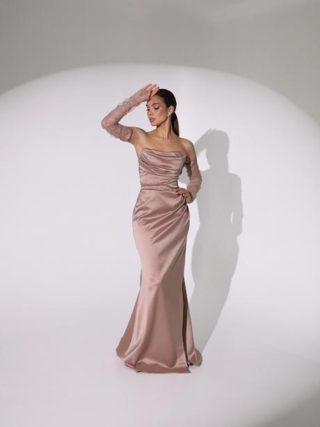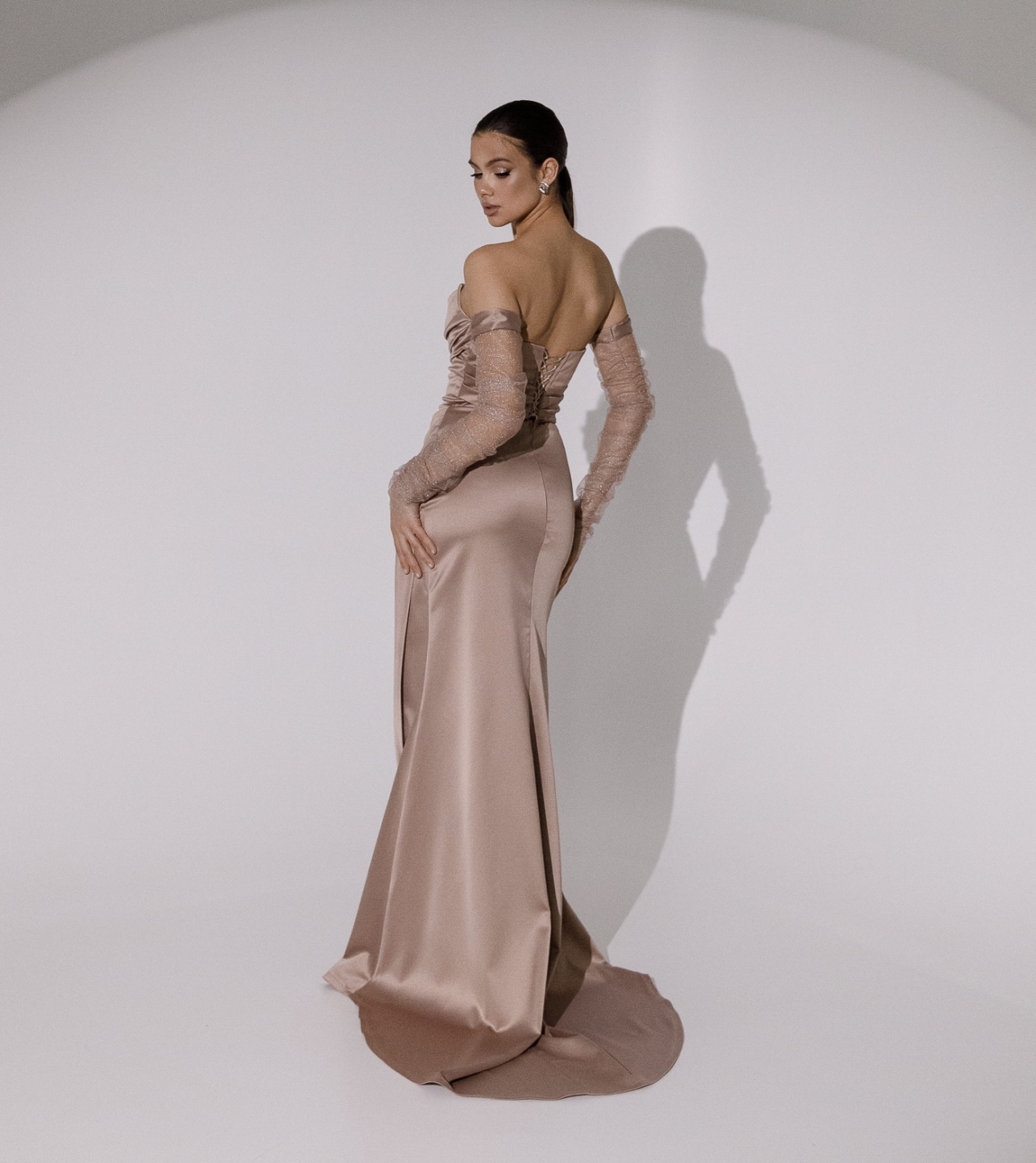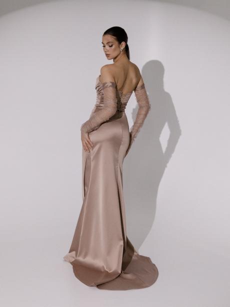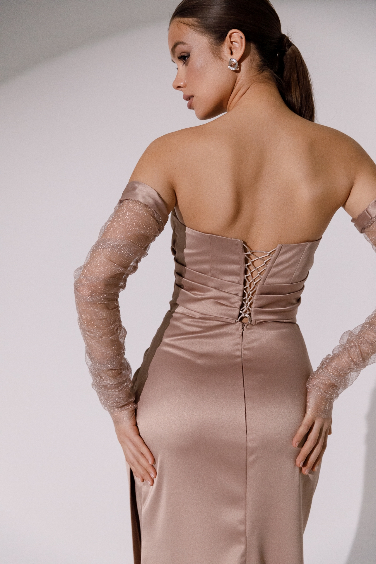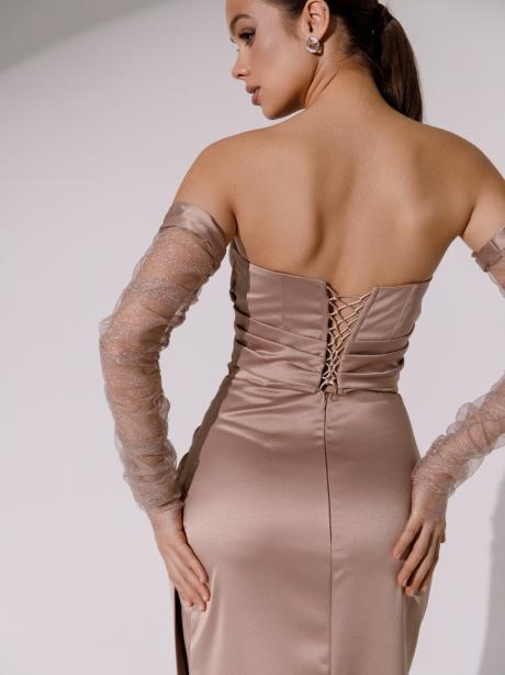 Вечернее платье в длине макси. Атласное длинное корсетное платье с элегантным разрезом по ноге, утонченная драпировка, сьемные рукава из мерцающей сетки. Корсет придает изящность фигуре девушки, силуэт «рыбка» создают интригующий элегантный образ. Размеры от 48 отшиваем по индивидуальным меркам, что обеспечивает идеальную посадку по фигуре.