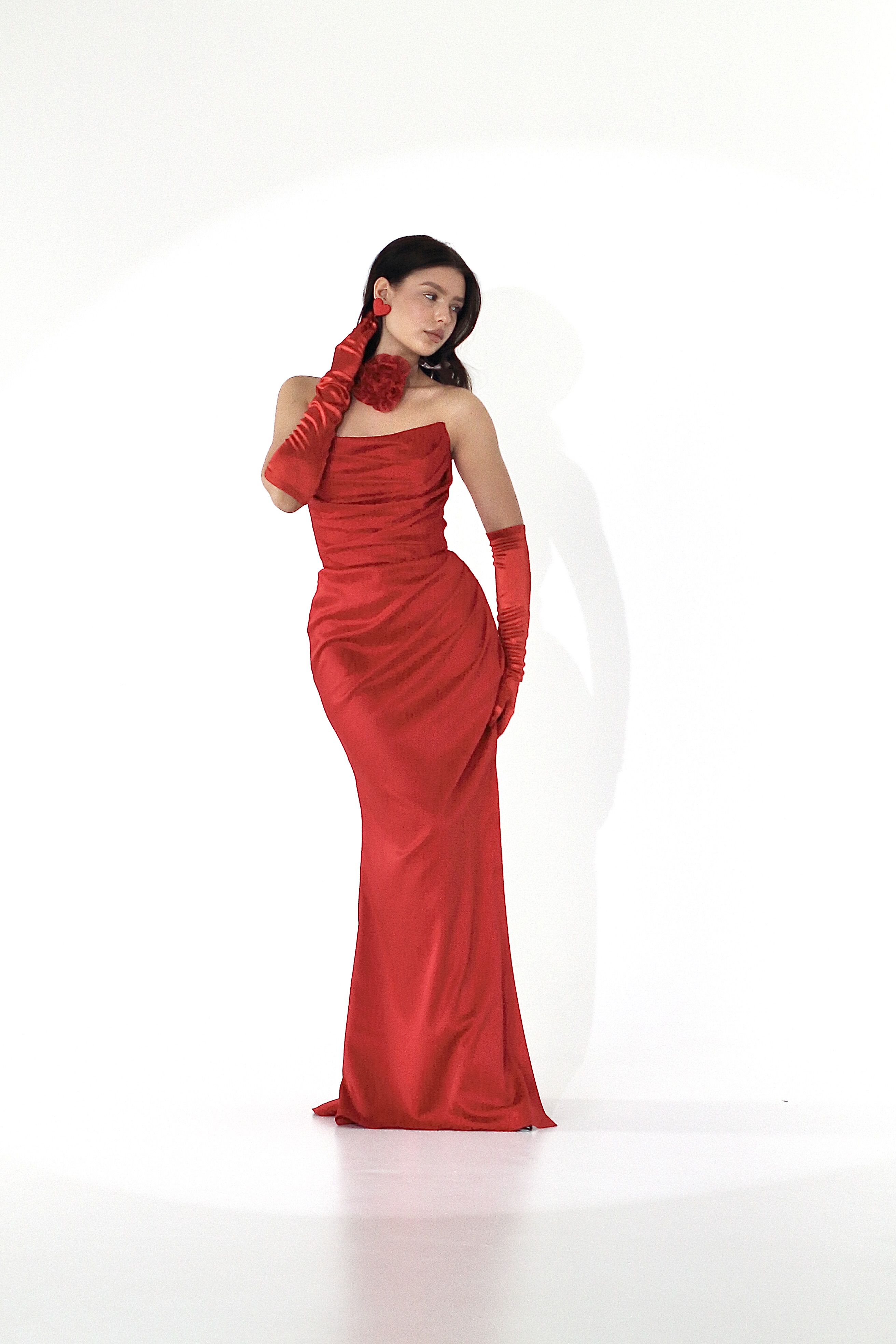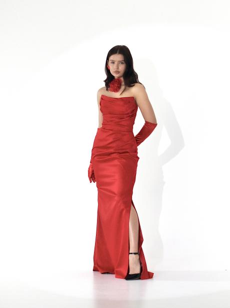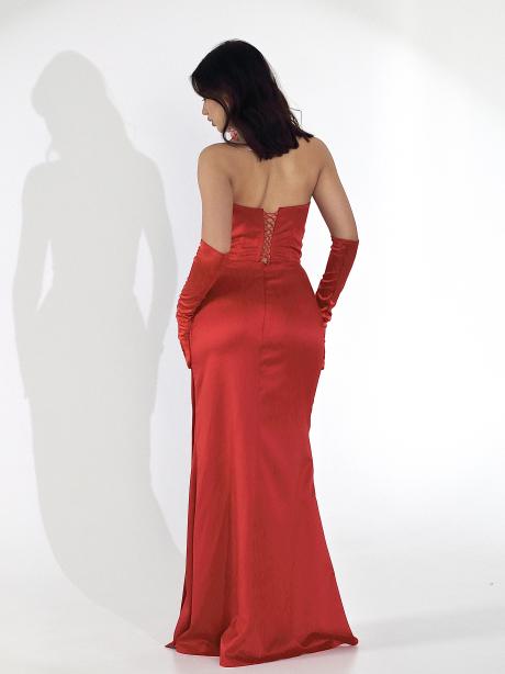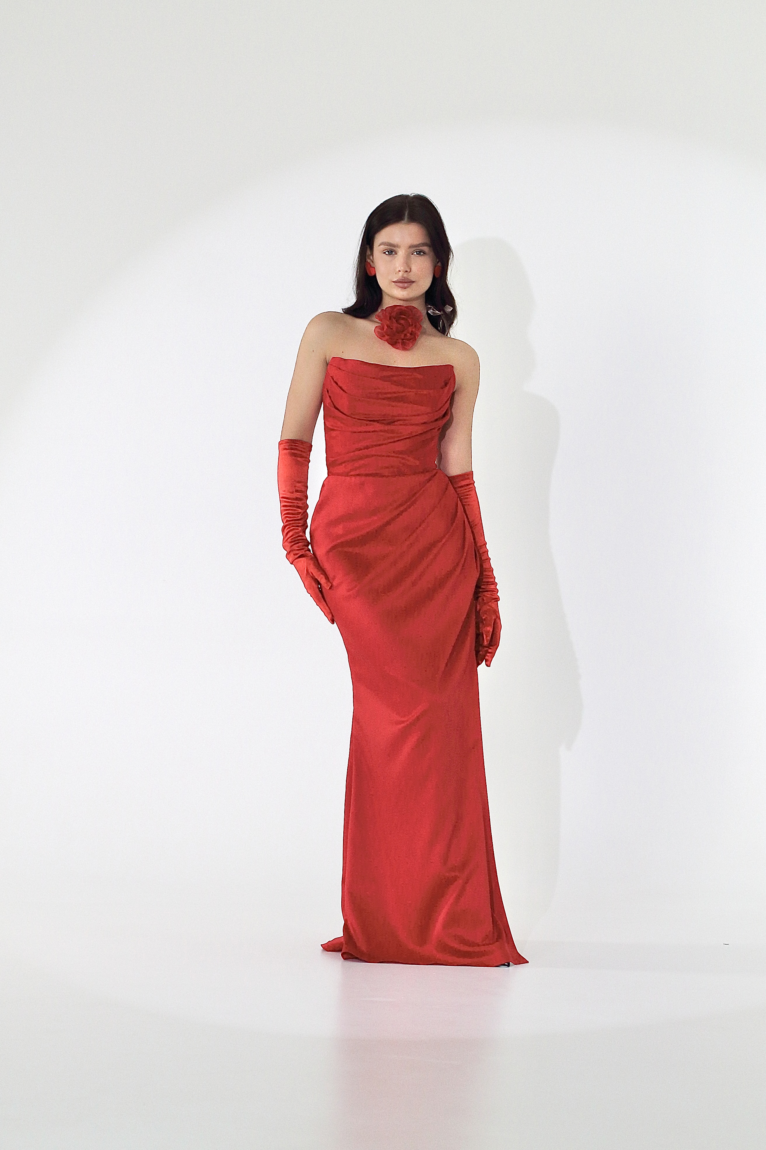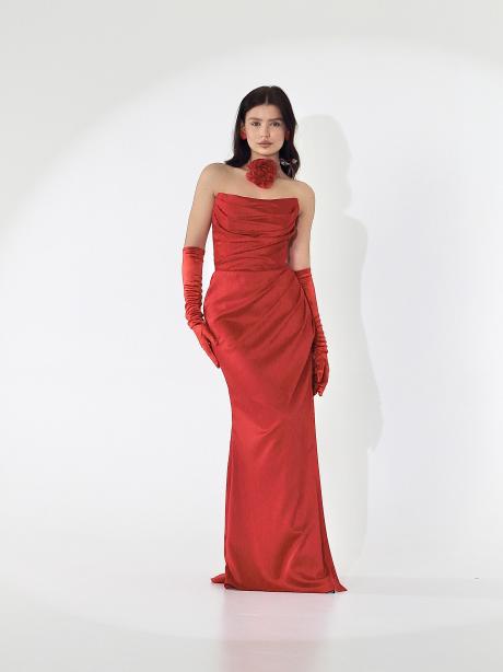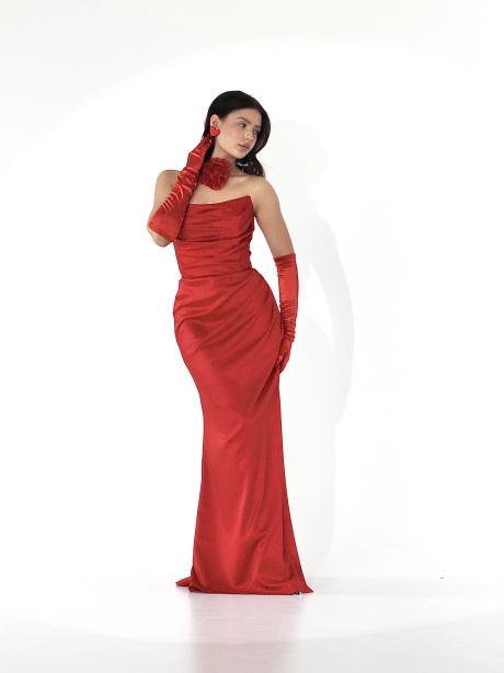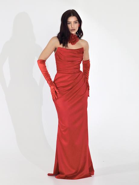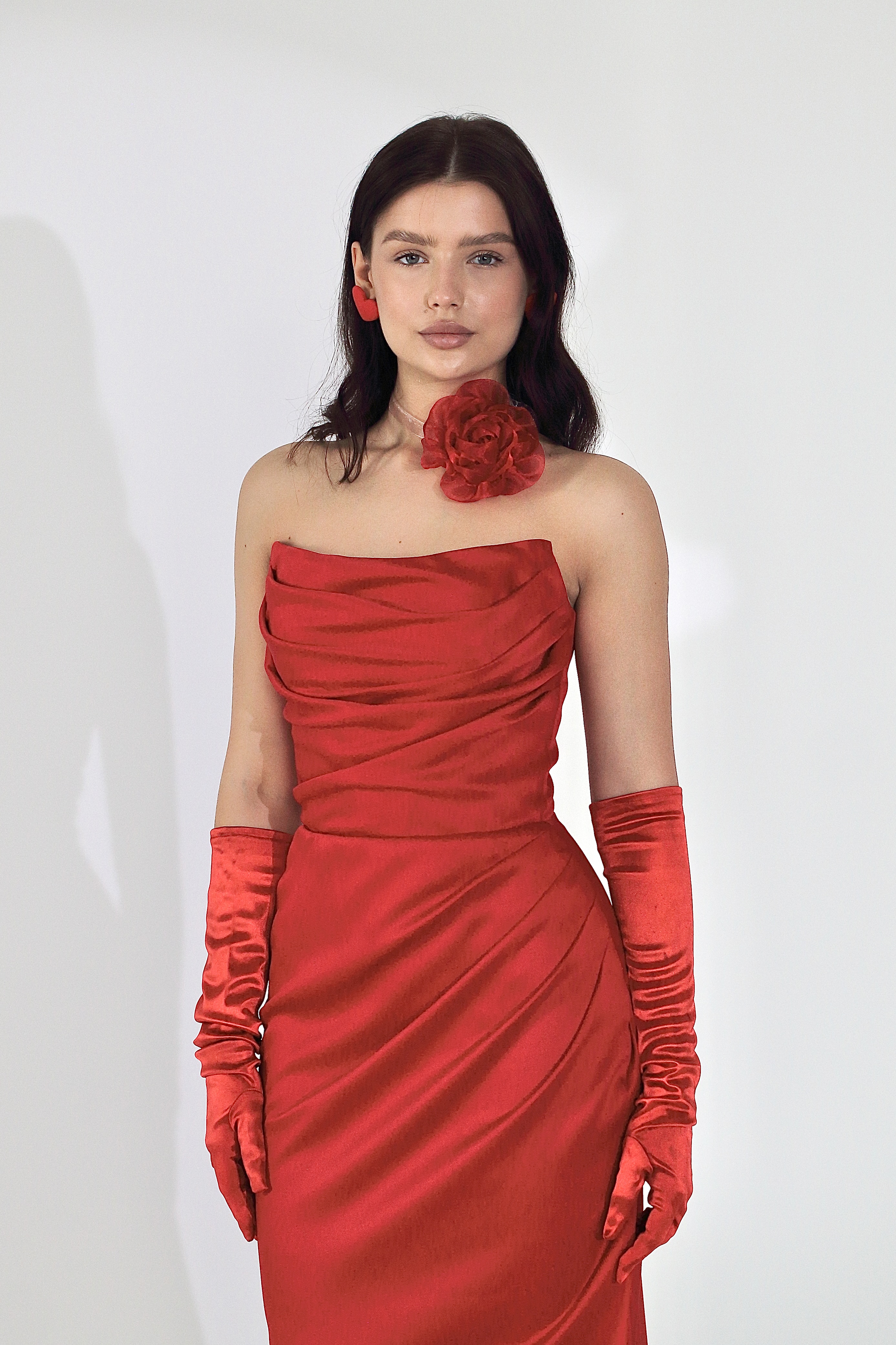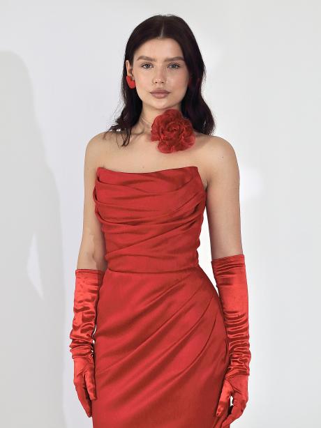 Красное корсетное платье в пол с разрезом. Образ дополнен перчатками и розой из органзы