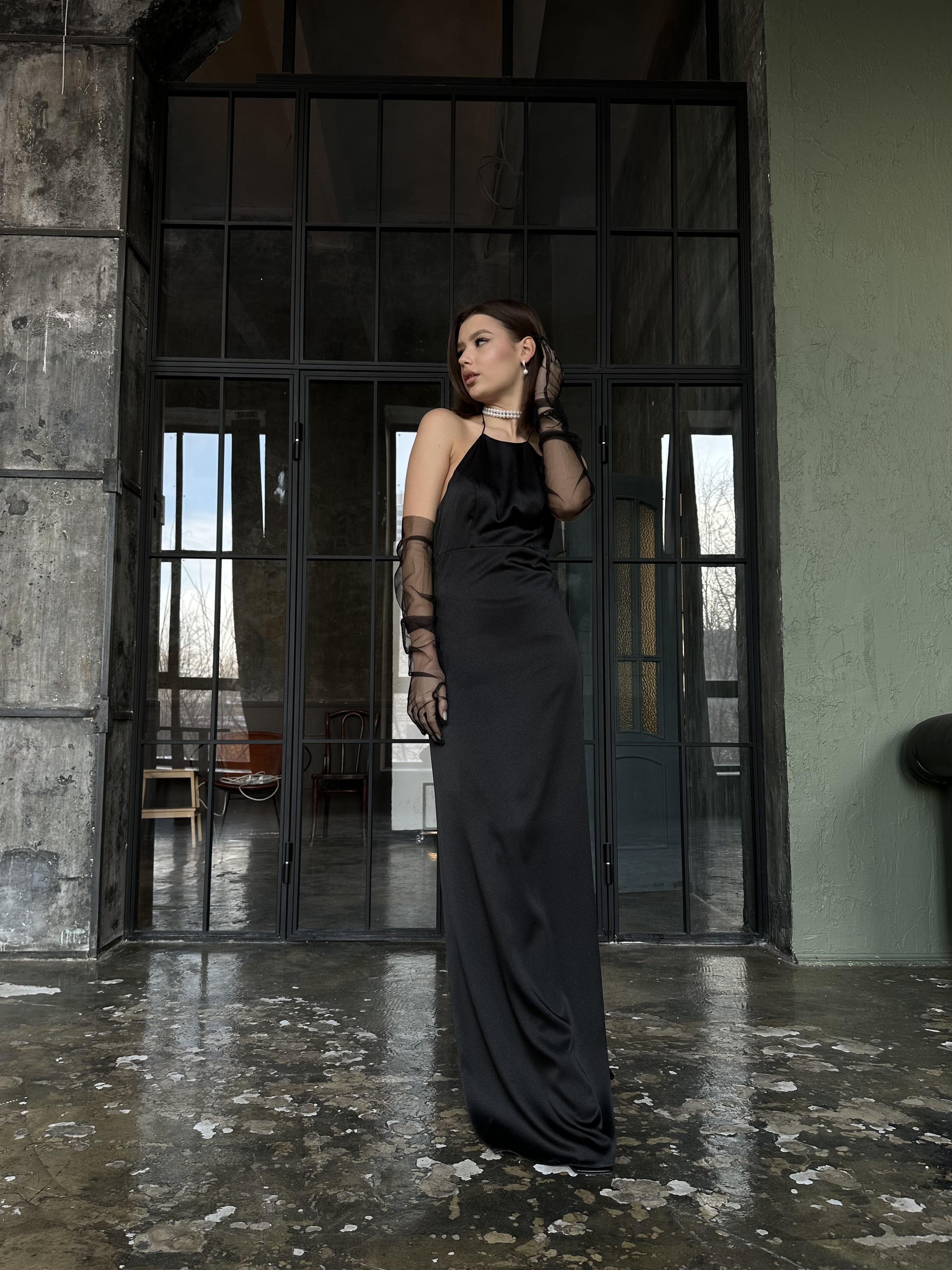 Платье в пол с американской проймой, полуприлегающего силуэта.